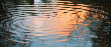This image captures the tranquil surface of water reflecting a golden hue from the setting sun, with subtle ripples creating an abstract pattern, evoking a sense of peace and serenity. AI generated image