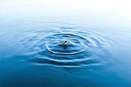 A water droplet creates ripples on the surface of the water. The image captures the moment of impact and the resulting circular waves.