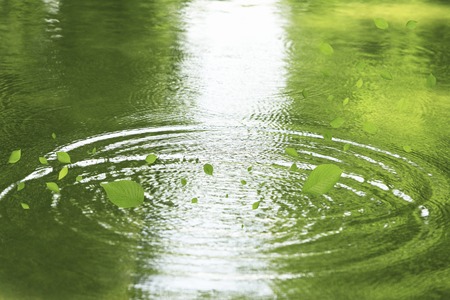 Water drop on green lotus leaf in the pond with ripples
