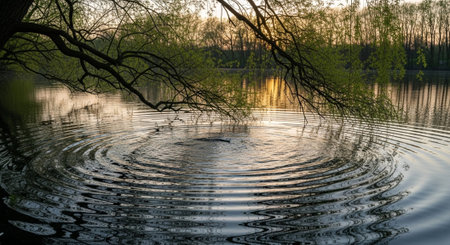 Gentle ripples spread across a serene lake's surface as the early morning light enhances the tranquil atmosphere. Nature's calm beauty invites reflection and peace.