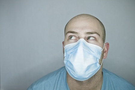 Serious young male model portrait wears medical mask over white wall.