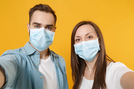 Two people in sterile face masks white t-shirts isolated on yellow background studio. Epidemic pandemic rapidly spreading coronavirus 2019-ncov medicine flu virus ill sick disease treatment concept.
