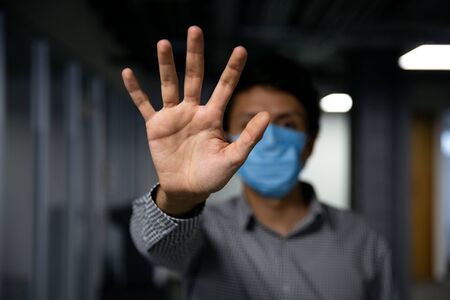Young man wearing a medical protective mask against the Coronavirus Covid 19, showing stop hands gesture to stop the infectious virus outbreak. Concept of stop infection epidemic virus symptoms.
