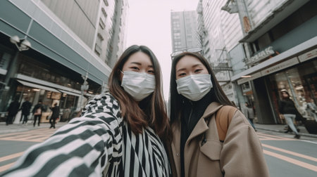 Generative AI : From above adult woman putting on medical mask of little girl while standing on city street during coronavirus pandemic