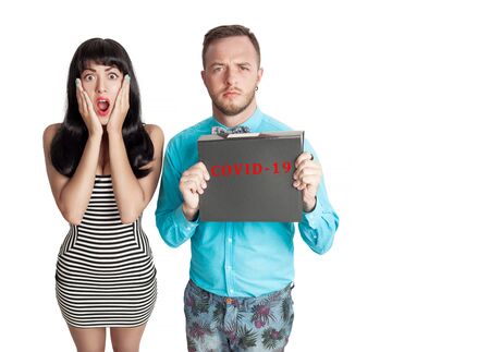 Coronavirus, red warning sign with the text Coronavirus in boy hands. Nearby, a girl in a panic holds on to her face. Epidemic, Chinese coronavirus 2020.