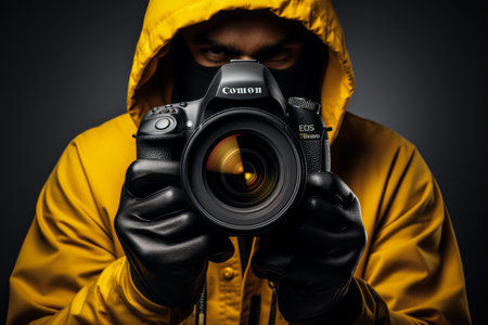 Close-up portrait of a young stylish man with a beard and dark hair in a black T-shirt. Male photographer uses a mirrorless camera to take a picture.