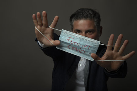 A Caucasian man is dissatisfied with the mask regime, the medical mask says fuck off covid