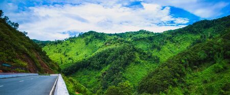 Mountain landscape under blue sky with clouds. Panoramic view.