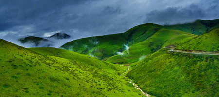 A sunny summer, a vast panoramic view of alpine meadows and natural grasslands.