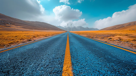 A mesmerizing view of an empty road cutting through a rocky desert landscape. The clear blue sky enhances the serene atmosphere, inviting exploration and adventure.