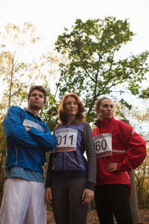 Group of young professional female runners wearing t shirts with number looking at camera while standing together, ready to start the race