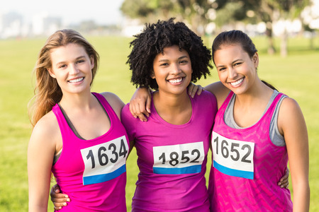 Portrait of three smiling runners supporting breast cancer marathon in parkland