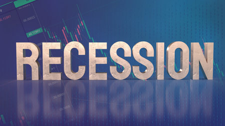 recession text in between graphs with stats going up then going down, concept of economic struggles after the pandemic