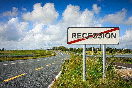 road with sign crossed with red line, symbolize that recession is over and blue sky