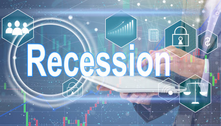 virtual touch screen of future and sees word: recession. Currency Depreciation Concept. Financial crisis, recession and depression.