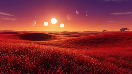 Alien planet landscape with multiple suns and moons in a vibrant sunset sky over red grass hills.