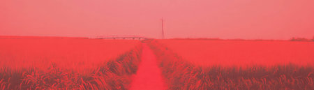 Bright rice field section with straight lines to a small bridge on vibrant red backdrop