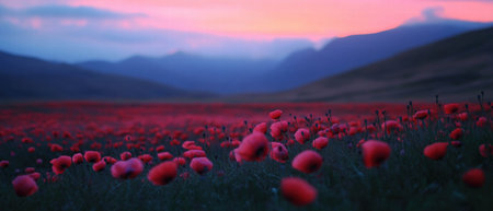 Fields of vibrant red poppies blooming against a stunning sunset backdrop