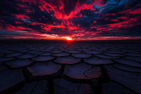 A stunning sunset over cracked earth landscape, showcasing vibrant red and blue hues in sky. dramatic clouds enhance beauty of this natural scene, evoking sense of awe and tranquility