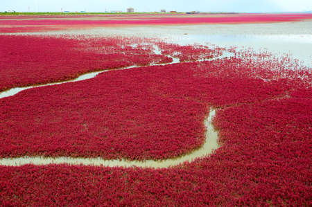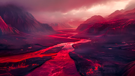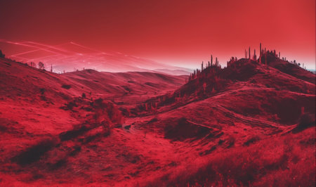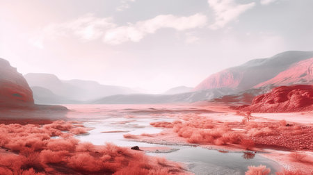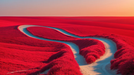 This stunning landscape features vibrant red grass against a serene pink sky, evoking a dreamlike quality perfect for artistic and nature-focused projects.