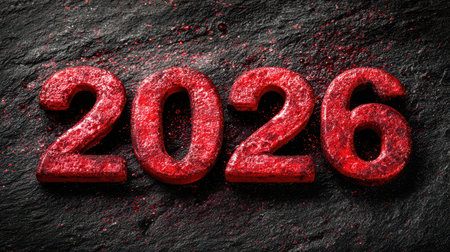Vibrant red numbers for 2026 lay on a dark surface sprinkled with festive glitter signifying a joyful New Year celebration.
