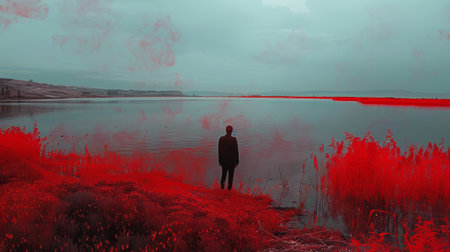 A man stands on a red field next to a body of water. The man is looking out over the water, possibly contemplating something. The scene has a somber and contemplative mood