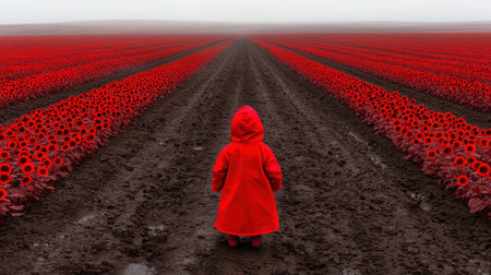 A child in a bright red coat stands alone in a stunning field filled with vibrant red flowers, adding beauty against a misty backdrop.