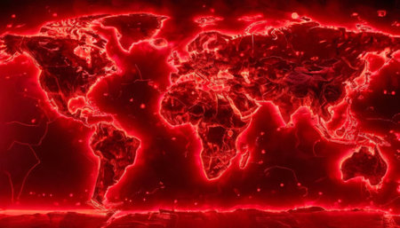 A striking digital visualization of the Earth's continents glowing with an intense red light against a deep black, cosmic-like background. The illumination appears concentrated on landmasses, suggesting a surge of energy, heat, or a widespread crisis. This abstract representation of the planet evokes a sense of urgency and global impact, with the dark void emphasizing the illuminated areas. The is abstract and conceptual, focusing on visual intensity and global scale.