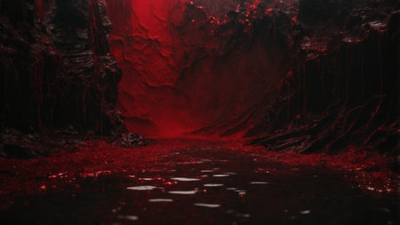 The walls give a mysterious feeling. and terrifying The background is matte black, not shiny, dull color. gives a mysterious feeling and terrifying The background is matte black, not shiny. Red, and black abstract wallpapers for murder and crime scenes. The image shows a red and black dark background texture. The shapes are a dark red color with black outlines. The background is slightly textured, giving it a sense of depth and dimension. gives a mysterious feeling and terrifying.