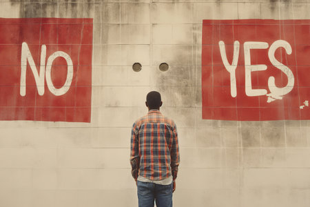 A man is standing in front of a wall with prominent NO signs on it, contrasting against a background of stark simplicity.