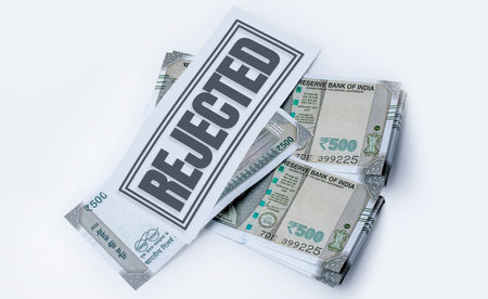 Bank loan rejected: Indian currency 500 rupees notes rejected on white background. Black and white.