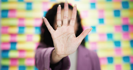 Woman, hand and stop with rejection on colorful background for no, refusal or objection in studio. Closeup, female person or warning with gesture or prohibition for denial, decline or protection