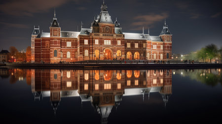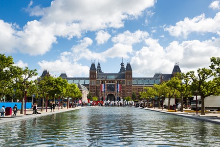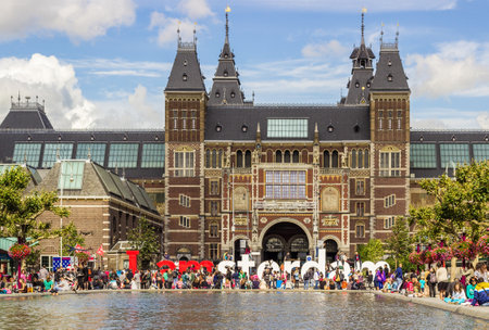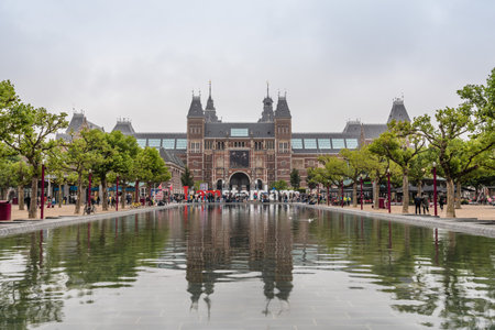 Amsterdam, Netherlands - August 2, 2016: Rjksmuseum in Amsterdam and reflections on pond a cloudy day. It´s a Dutch national museum dedicated to arts and history. It includes masterpieces by Rembrandt, Hals and Vermeer.