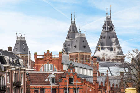 Amsterdam, Netherlands - 5th June, 2019: Dutch national art museum. Closeup of part of the Reichsmuseum building in Amsterdam. Decorations and detailes of the facade, roof and windows of the museum building.