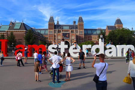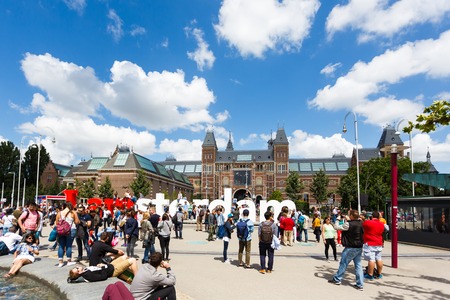 AMSTERDAM, NETHERLANDS - JULY 9, 2017: People visit photo sign in front of Rijks Museum in Amsterdam.