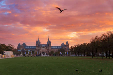 Amazing vibrant sunrise at the Museum Square (Museumplein) in Amsterdam, The Netherlands, looking towards the beautiful National State museum (Rijksmuseum)