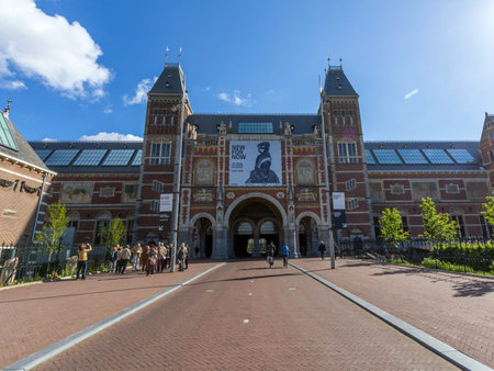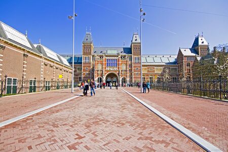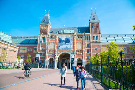 Amsterdam, Netherlands - April 20, 2017: People walking near Rijksmuseum Amsterdam museum in Amsterdam, The Netherlands