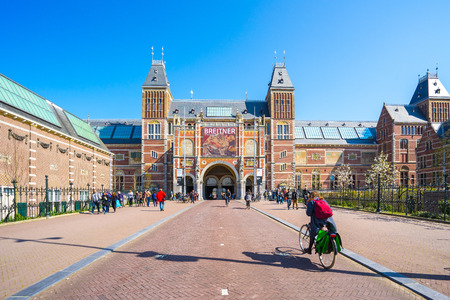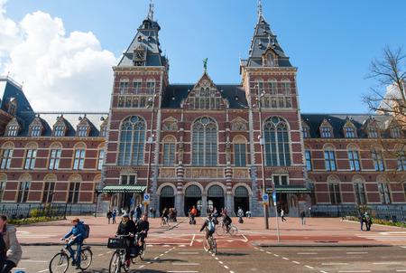 AMSTERDAM-APRIL 30: Facade of the Rijksmuseum, people ride bicycles on April 30, 2015. The Rijksmuseum is a Netherlands national museum dedicated to arts and history in Amsterdam.