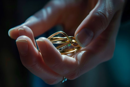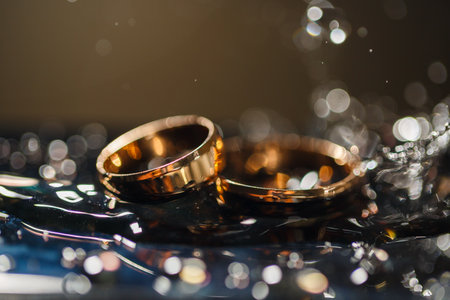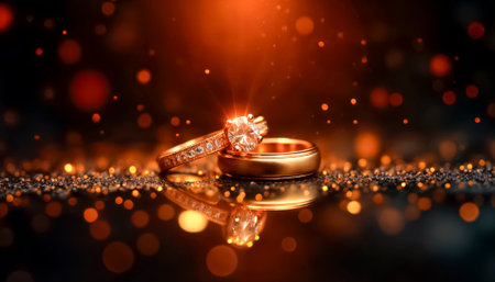 Close-up of elegant wedding rings resting on a sparkling golden background, showcasing a romantic and luxurious atmosphere perfect for celebration and love.