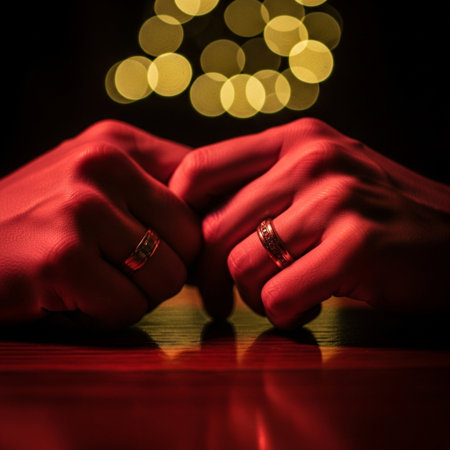 This striking image features two modern rings illuminated with glowing blue and red lights, set against a dark textured surface. Perfect for themes of love and commitment.