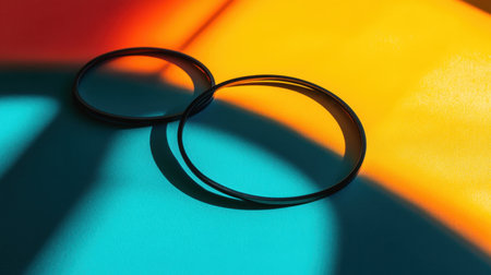 This artistic image showcases two circular shapes resting on a vibrant background, with dynamic colors and striking shadows creating an eye-catching composition.