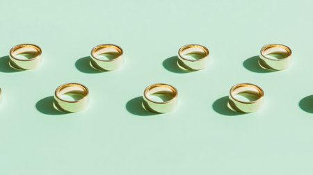 A collection of elegant gold wedding bands arranged neatly on a soft green background, evoking themes of love and commitment for weddings and partnerships.