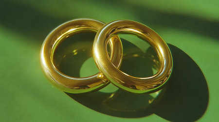 Capture the essence of love with these elegant gold rings resting on a vibrant green surface, showcasing their stunning luster and intricate design.