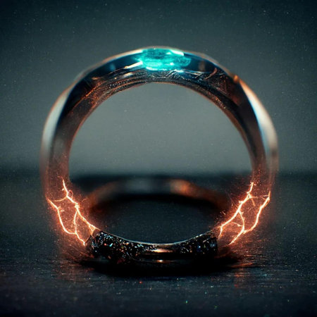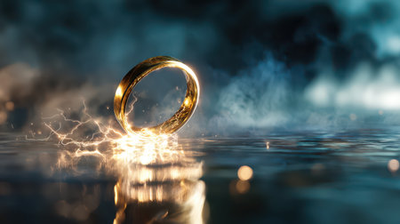 Enigmatic Golden Ring Surrounded by Mystical Sparks and Water Reflections in a Darkly Lit Environment