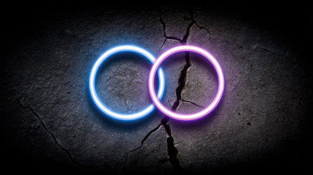 Two glowing neon rings are displayed against a textured, dark gray background marked by a vertical crack. The rings, one blue and one pink, are the focal point, creating a visual contrast. The lighting suggests a dramatic or artistic style. This imagery is suitable for various conceptual or design projects.