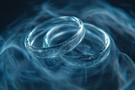 Two beautifully crafted crystal wedding rings are positioned close together against a soft, smoky backdrop. The rings reflect light, creating a stunning visual that symbolizes love and unity, perfect for celebrating a special occasion.