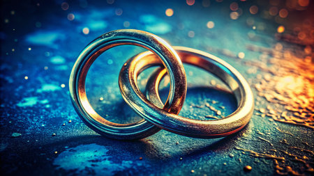 Two interlocking rings, one blue and one gold, are illuminated by warm orange and cool blue light, creating reflections.