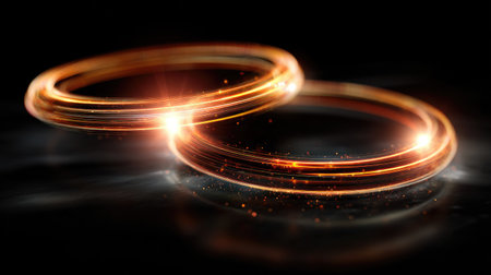 Stunning image of two elegant wedding rings emitting glowing light trails against a dark background, symbolizing love, unity, and celebration.
