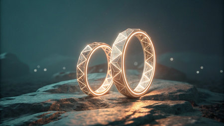 Glowing geometric rings rest on dark rocks, ethereal digital art