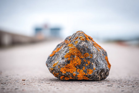 Close-up of a lichen-covered rock on a concrete path, blurred industrial background
